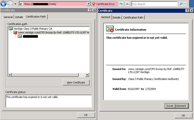 Vid felsökning testades certifikatet med Verisigns testverktyg vilket påvisade att Intermediate Certifikatet gick ut 2004.