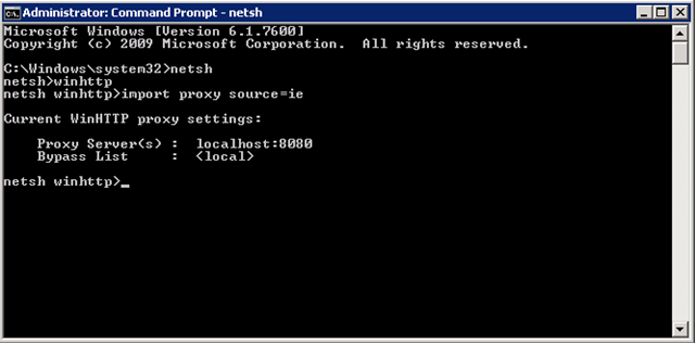 Lösningen här var att konfigurera TMG Servern att använda sig själv (localhost) som proxy, att enbart konfigurera webbläsaren med localhost som proxy räcker dock inte utan det krävs även att WinHTTP tjänsten får samma konfiguration. Jag konfigurerade därför IE med proxyinställningar Localhost port 8080 efter detta importerar jag inställningarna till WinHTTP tjänsten med kommandot nedan: