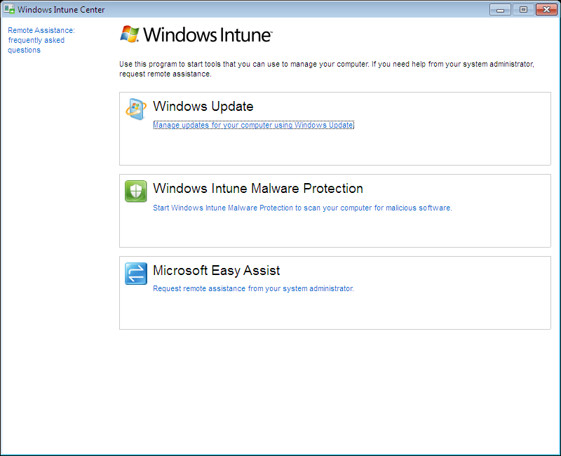 Direkt efter utrullning av klienten får användaren en Intune ikon på skrivbordet. Från denna kan användaren övervaka Windows Update, Malware Protection eller begära fjärrhjälp. Det är tydligt och lätthanterligt.