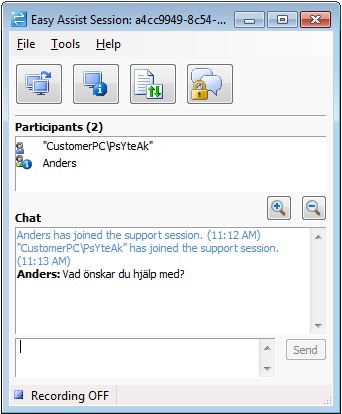 Förutom att ta över användarens gränssnitt har du bland annat möjlighet att skicka över filer, välja att starta om datorn och ansluta på nytt till användaren.