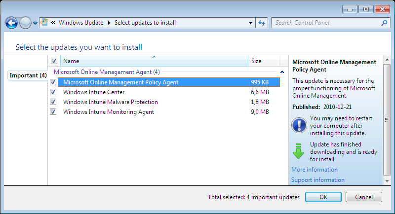Installationsfilen är en MSI fil som du enkelt kan trycka ut via en GPO i Active Directory, efter att agenten har blivit installerad kommer Windows att ladda hem ett antal uppdateringar vid nästa uppdateringstillfälle. Eller som i det här fallet där jag installerar komponenterna manuellt.