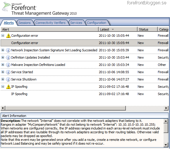Allt för ofta när jag kommer ut till en befintlig Forefront TMG eller UAG lösning hittar jag larm som ser ut enligt bilden nedan och får även höra att det är problem att nå vissa enheter eller tjänster.