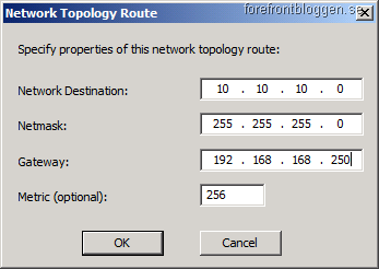 I tidigare ISA/IAG lösningar var man tvungen att använda “Route Add kommando” på varje ISA/IAG i exempelvis ett kluster men i TMG finns nu ett mer enkelt och användarvänligt sätt att hantera Steg 1 i detta tillvägagångsätt.
