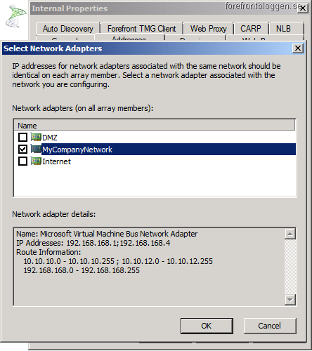 I TMG konsolen gå in under Networking och fliken Networks. Dubbelklicka på Internal Network och till fliken Addresses, välj Add Adapter..