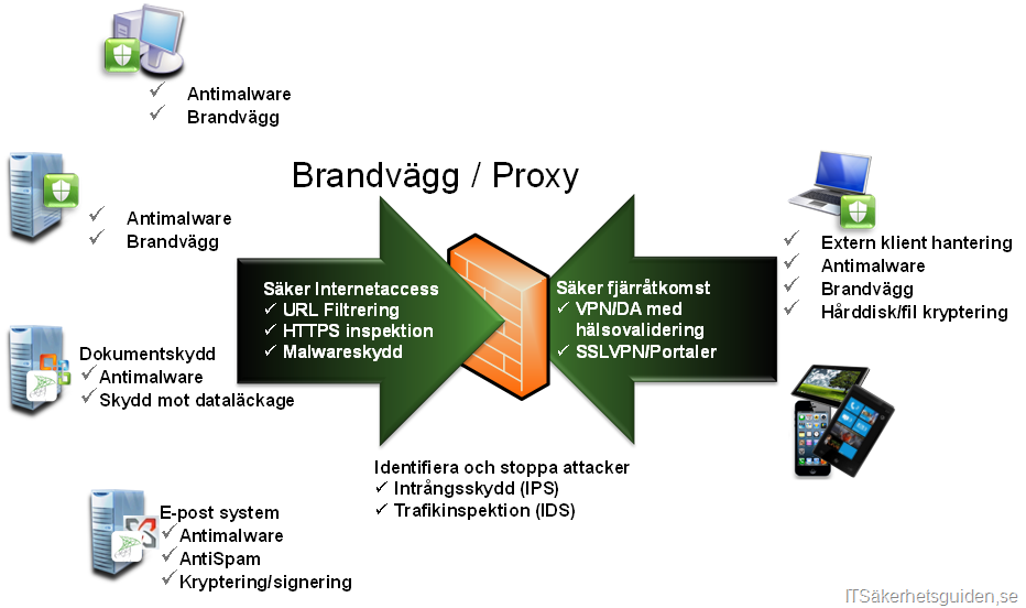 Den här bilden illustrerar några av de säkerhetsfunktioner som finns idag.