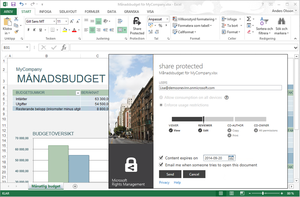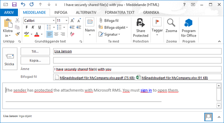 Ni som redan kör RMS har idag en funktion i Office som på svenska heter ”Dela skyddat” på svenskt Office.