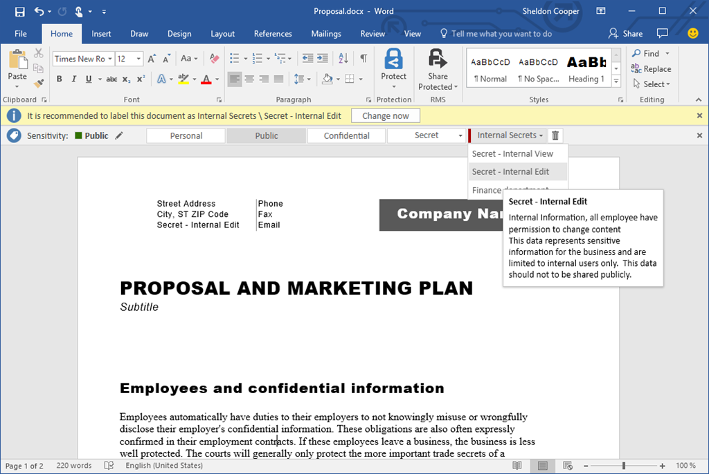 Klassificeringen i det här fallet skulle även kunna vara att krypteringen av dokumentet ändras till att skyddas av AD RMS och då också säkerhetsställa att ingen extern part kommer kunna nå informationen.
