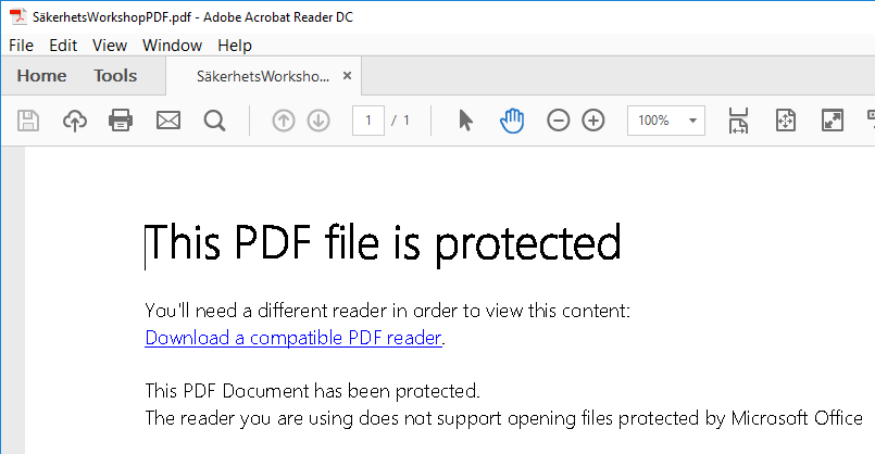 Om PDF-filer försöker öppnas med en läsare som inte supporterar RMS får användaren följande: