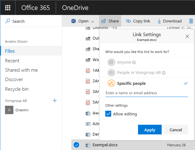 Det som inte fungerar är att skicka en direktlänk till dokumentet om det inte finns definierat att just den användaren även har RMS-mässigt behörighet till dokumentet.