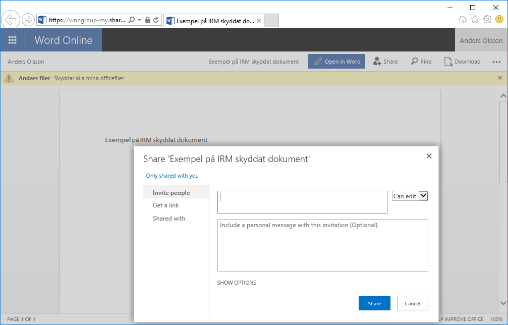 SharePoint (OneDrive for Business) IRM säkerhetsställer att informationen är skyddad när den lämnar SharePoint.