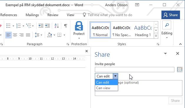 RMS krypterar och definierar behörighet i form av enbart visning eller editeringsmöjlighet utefter de två alternativ som finns vid delning, view eller edit.