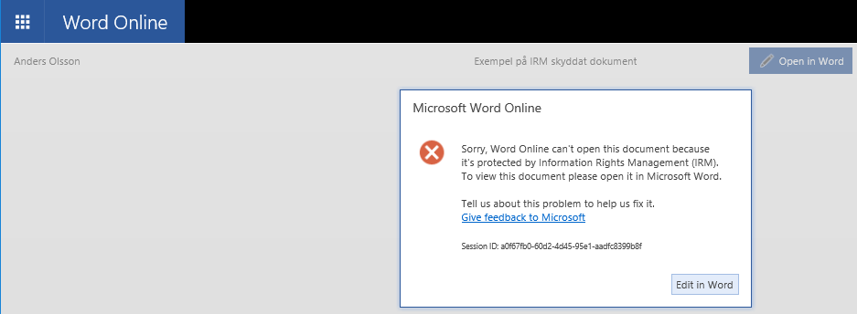 Notera här att det är tack vare IRM som skyddade Office-filer kan visas med exempelvis Word Online, då IRM hanterar både kryptering och dekryptering med RMS. En fil som är RMS skyddad innan uppladdning är inte läsbar av IRM och kan därav inte visas med online-tjänsterna. Där emot kan en fil som RMS-krypterats av IRM flyttas mellan olika bibliotek i SharePoint/OneDrive och på så sätt se till att rätt personer har tillgång till dokumentet. Det är användarnas rättigheter till det aktuella biblioteket eller filen i sig som definierar RMS-behörigheten.