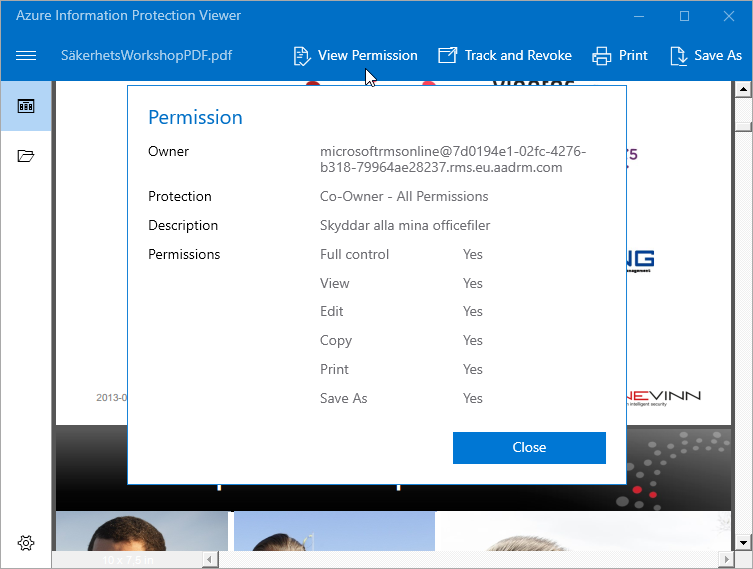 Skyddade PDF-filer öppnas med Azure Information Protection Viewer, eller annan PDF applikation med stöd för RMS.