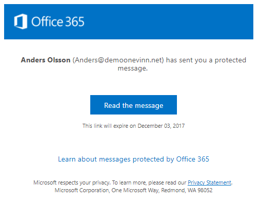 Länken pekar egentligen till avsändarens Office 365 och den skyddade informationen redovisas för användaren utan att lämna Exchange.