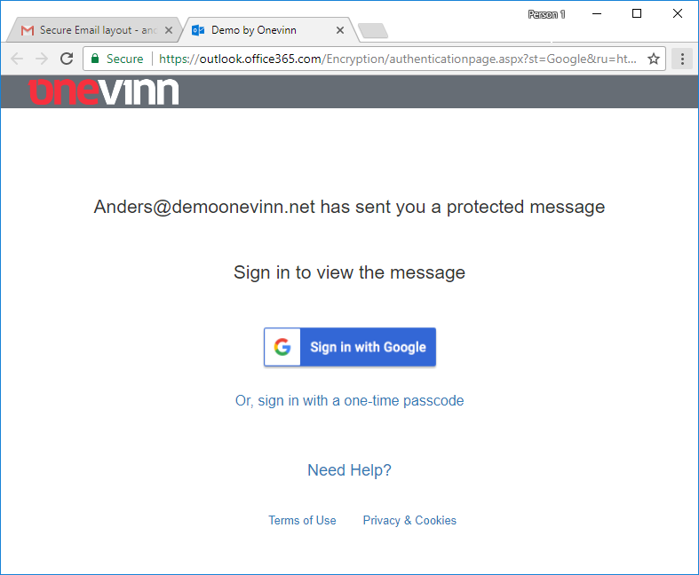 Användaren kan välja att autentisera sig med sitt emailkonto (av typen Azure/Microsoft account, Google eller Yahoo) och skulle den möjligheten saknas finns även en möjlighet att logga in med en engångskod (OTP). Denna OTP levereras som ett ytterligare mail med automatik.