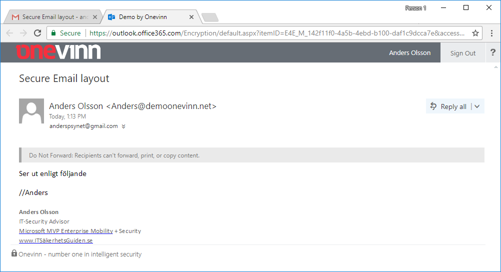 Om mottagaren använder sig av en mailapplikation som förstår RMS, exempelvis Outlook eller dess webbgränssnitt visas mailet precis som övriga mail.