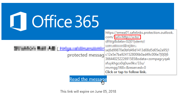 - När du håller musen över ”Read the Message” -länken ser du att den inte pekar inte på ”outlook.office365.com”
