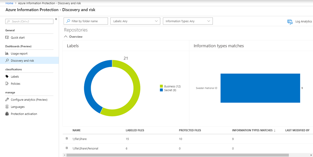 Här får du en tydlig överblick och kan välja att till exempel filtrera på ett visst file share och se både vilka filer som är klassificerade/skyddade men också vilka filer som innehåller känslig information men saknar skydd.