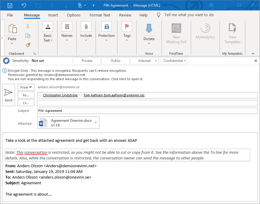 När användaren bekräftar rekommendationen får själva e-postmeddelandet motsvarande label och när det skickas kommer Exchange att kryptera epostmeddelandet till mottagaren utan att begränsa dess möjlighet att skicka det vidare. Behörigheten på den bifogade filen skyddar filen att kunna delas utanför mottagarens organisation.