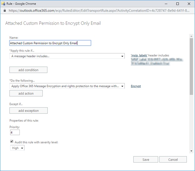 För att få kryptering lägger vi på en Exchange Transport Rule som krypterar epostmeddelanden med denna Label. Krypteringen som vi applicerar ger fulla rättigheter till mottagarna som då även kan vidarebefordra epostmeddelandet vid behov. Eftersom själva dokumentet redan är krypterat (med Custom Permission) kommer inte e-postmeddelandets bilaga förändras utan behörigheten till dokumentet begränsas alltid till det som användaren definierade initialt.