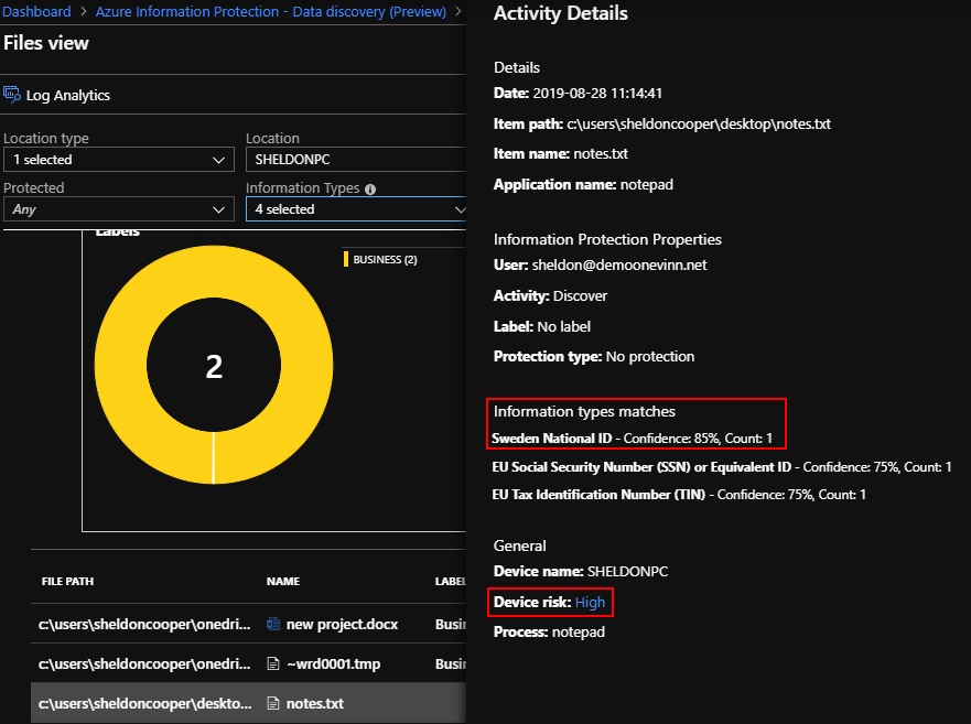 Tack vare att alla dessa tjänster nu centraliserar sin loggning får vi ett kraftfullt verktyg med AIP Analytics. Verksamheten kan nu få en överblick av sin information både från vår lokala miljö, vår molnlagring, våra klienter och Office-installationer. Filer med känslig information redovisas med informationsklassifikation samt om den är krypterad/skyddad med RMS eller WIP.