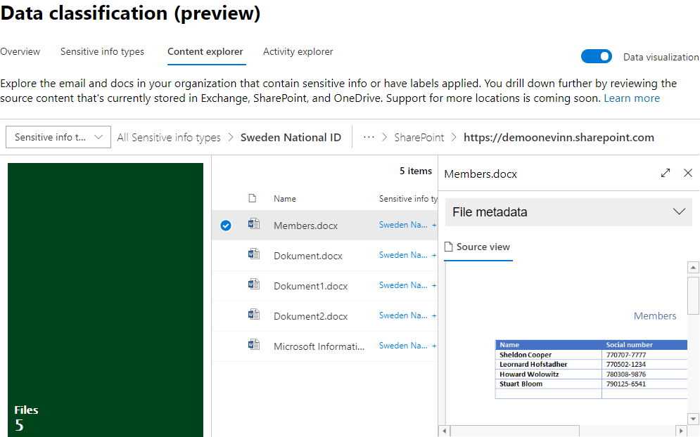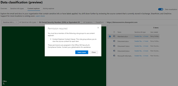 Vidare har vi även möjlighet att se detaljer och se aktuella data som innehåller den här informationen. Första frågan som de flesta organisationer ställer sig här rör både privacy och governance, vem kan se det här och hur kan vi styra/kontrollera vilka som har den här möjligheten.