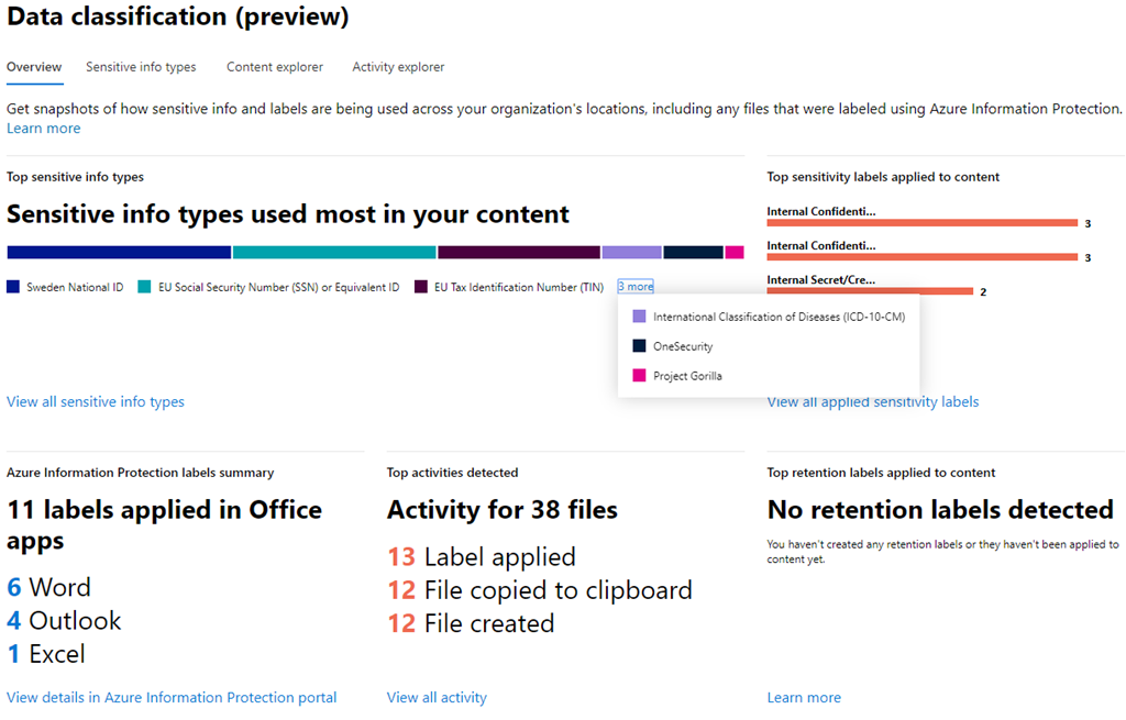 På samma sätt som att vi idag konfigurerar Unified Labels och kan skräddarsy egna informationstyper från den här portalen kan vi även följa upp hur dessa används. I nuläget är det mest information från data som lagras och hanteras av Office 365. Vi kan följa upp vilka informationsklassifikationer/labels som används mest och se vilka informationstyper (både fördefinierade och egna) som förekommer både i nya och lagrade filer.