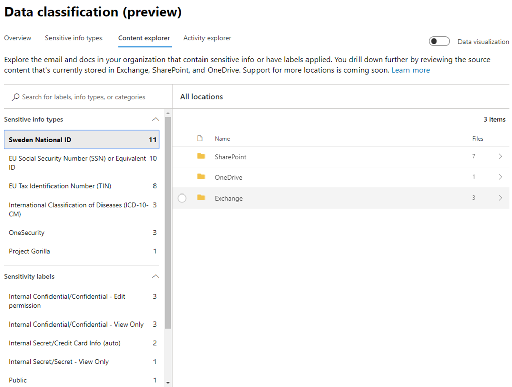 För att lista data som innehåller dessa informationstyper används Content explorer. En första vy ger oss en inblick i hur många filer som uppmärksammats med de mest förekommande informationstyperna. På samma sätt listas även de mest nyttjade informationsklasserna (Sensitivity labels). Vi får en tydlig bild över vilka Office 365 tjänster (Exchange, SharePoint, OneDrive) som innehåller de här informationstyperna eller klassificerad information. Den här listan kommer växa under året med fler källor.