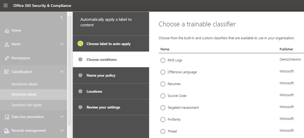 Let’s create our own trainable classifier. The requirement is that the content needs to be stored in SharePoint Online. The file types that are supported are listed here. It needs to be 50 files at least, where the latest 500 files are the once that will be scanned (if the location includes more files).