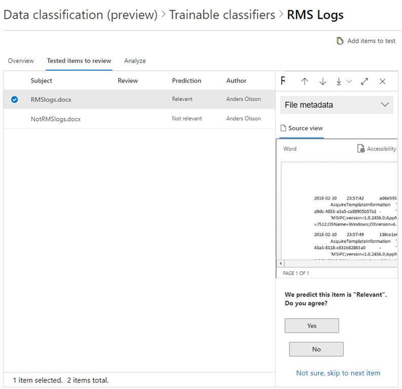 I started out with creating two word documents, one with RMS log data and another one with only some characters from a log and other data that shouldn’t be identified as a RMS log. I uploaded these to another folder in SharePoint and added this location