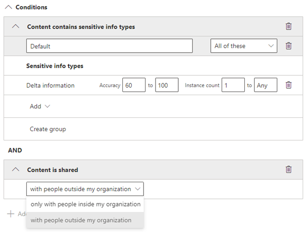 Another scenario would be more advanced rules for instance to only label Project Delta information that is being shared externally.