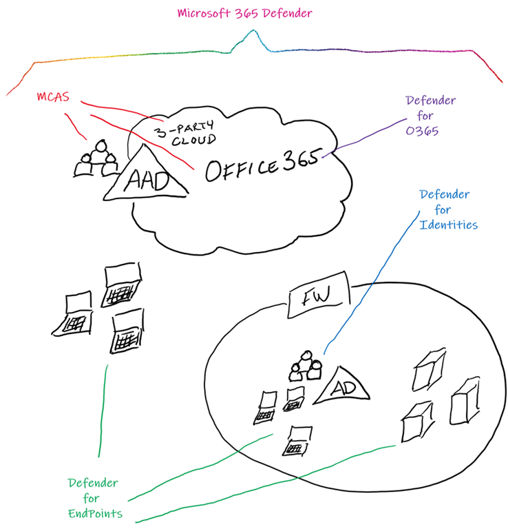 Detect and response on threats on your endpoints, from computers, tablets, cellphones to servers - MCAS, Microsoft Cloud App Security still have the same name. MCAS protect our cloud apps, Office 365 and other 3-party cloud apps. MCAS also integrates with Azure Active Directory Identity Protection that protect our identities in Azure AD. All of these important signals from our cloud identity and our connected cloud apps are shared with Microsoft 365 Defender.