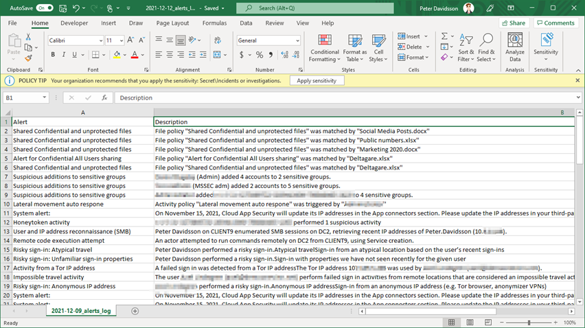 For example, if someone download alerts reports including sensitive security/compliance incidents from the Defender portals and open them in M365 apps, the user will be prompted to use this label.