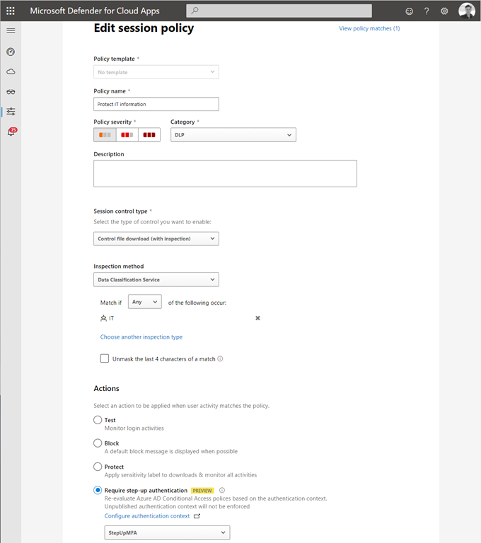 Since we have support to use the trainable classifier with Microsoft Defender for Cloud Apps we can also create session policies to define rules with Conditional access for this information. We can for instance block download or access from unmanaged devices. In this session policy I require MFA to be able to download files including sensitive IT information