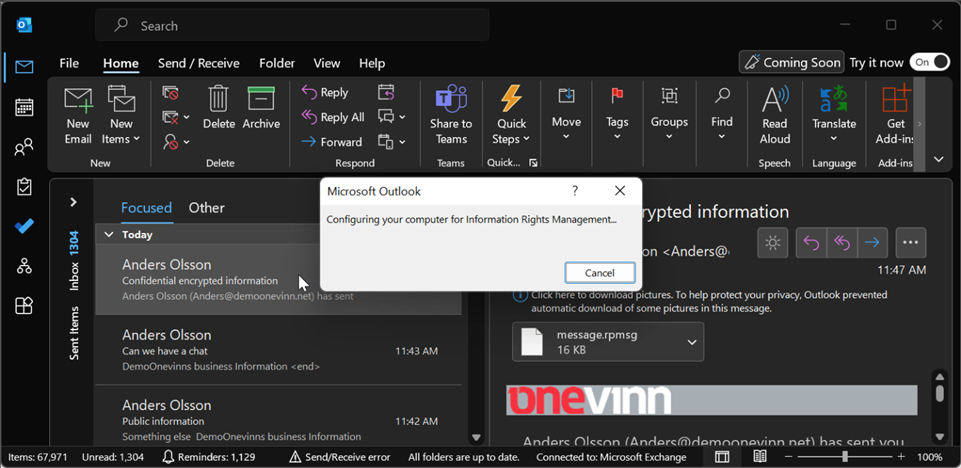 The problem when you need to authenticate to decrypt a protected message that comes from an external organization is that Outlook uses the signed in account and its token to authenticate to the sender’s tenant. If MFA is required Outlook doesn’t support re-authenticating to the sender’s organization with MFA against this tenant.