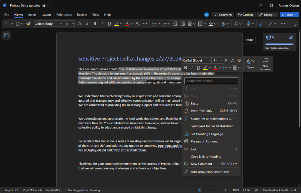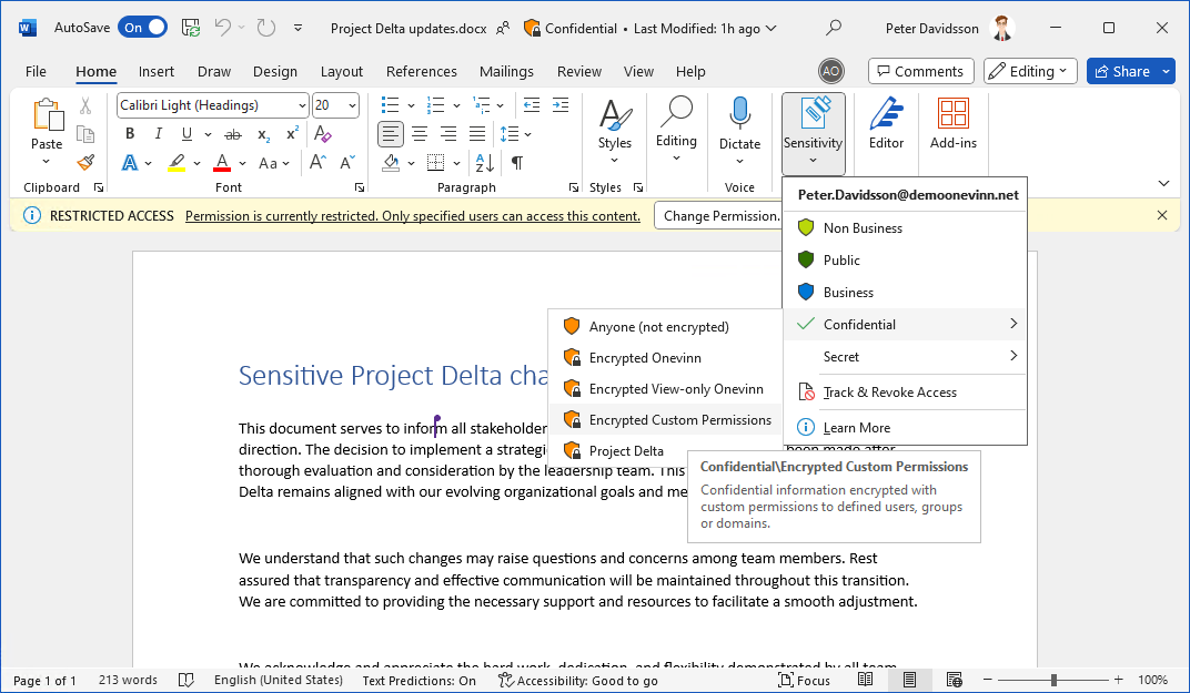 While we still rely on locally installed Microsoft 365 apps like Word, PowerPoint, and Excel for encryption, the introduction of Custom permissions empowers users to determine who has access and the level of access for specific documents or presentations. These permissions can be assigned to internal users, groups, as well as external users and entire organizations. Consider the following examples where sensitive information needs protection: