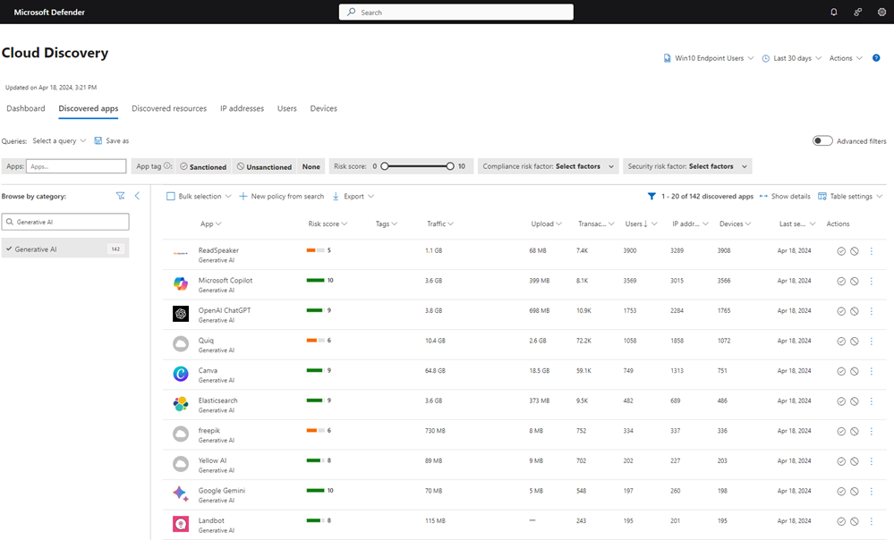 Microsoft Defender for Cloud Apps is a solution that gives you visibility and control over your cloud apps and services. With Defender for Cloud Apps, you can discover which cloud apps and services are being used in your organization. Over 31,000 applications have been security-reviewed and categorized to provide more insight into what the app is and the risks it might pose, such as where data is stored and who owns the service. One of these categories includes generative AI services like Microsoft Bing Chat, Google Bard, ChatGPT, or Amazon AI. You can also monitor and analyze user behavior, data flows, and security incidents in your cloud apps and services.