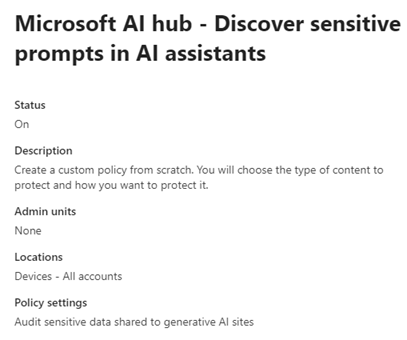You can read more about Microsoft’s AI Hub itself here: Microsoft Purview data security and compliance protections for Microsoft Copilot and other generative AI apps | Microsoft Learn