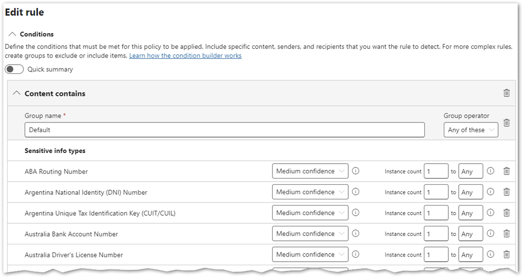 This is a good starting point for inventorying the data used in these AI services. However, my advice is to undertake a review to determine which data is truly sensitive and critical within the organization. Customize this rule accordingly and include the data that is most relevant to monitor. If you haven’t already done this work, it involves initiating a Data Discovery process by engaging information owners and other stakeholders in the organization to: