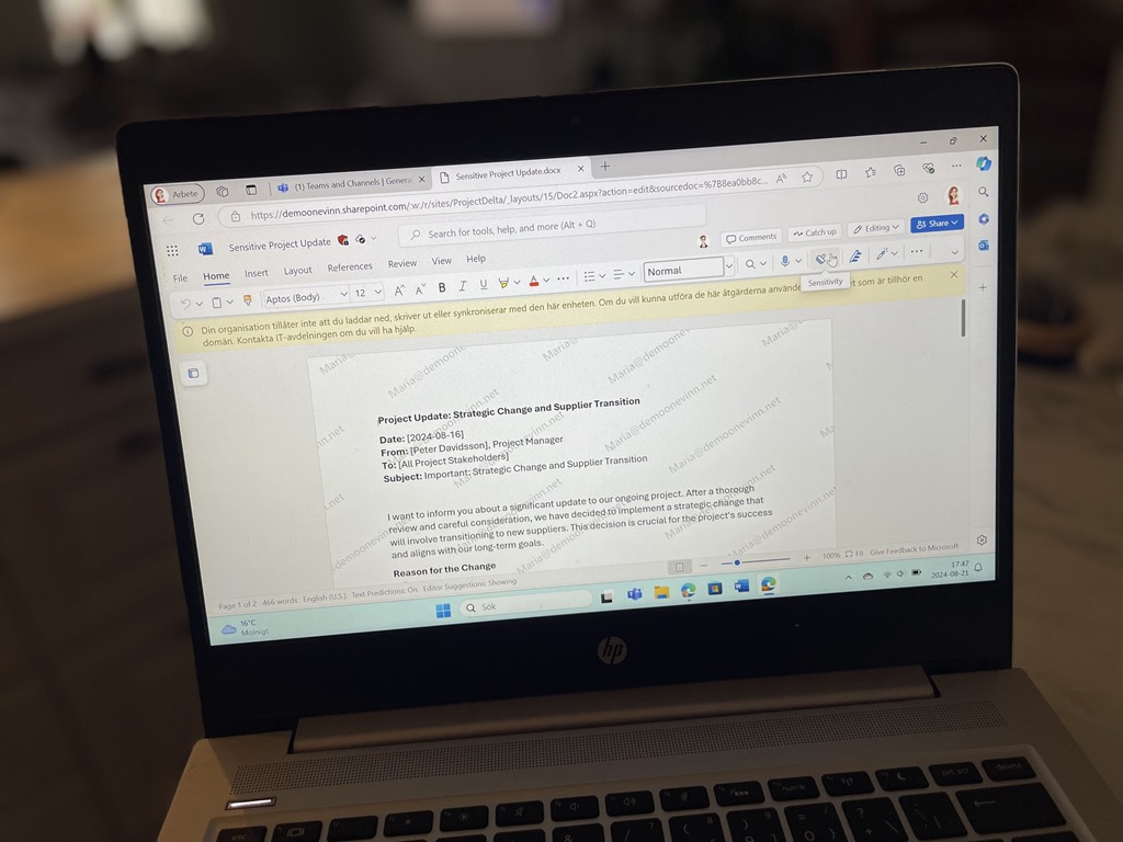Funktionen gör att alla dokument som är märkta och skyddade med denna label visualiserar vilken behörig användare som har öppnat filen. Därmed kan vi se på en bild vilken skärm som har fotograferats och få bättre spårbarhet.![]()