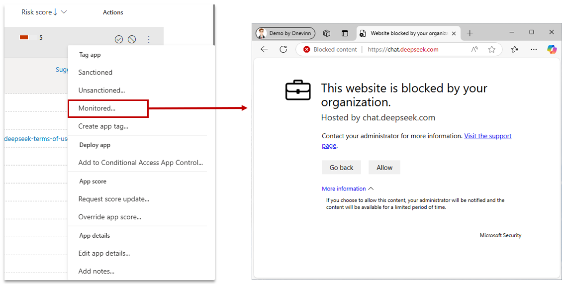 Effekten blir till exempel att vi blockerar användaren från att använda känslig data i Deepseek, men tillåter att samma data används i ChatGPT – efter att användaren uppmärksammats.