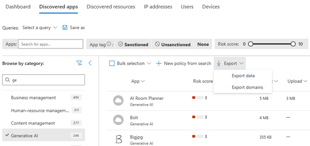 Vill vi enkelt se vilka domäner som tillhör respektive Generative AI-tjänst, kan vi exportera detta direkt från Defender for Cloud Apps med hjälp av funktionen Export domains.