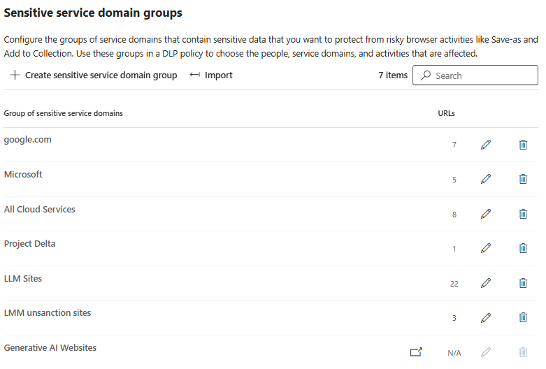 För att styra vilken data får användas i vilken AI-tjänst, behöver vi först bygga upp listor med Sensitive Service Domain Groups i Purview.