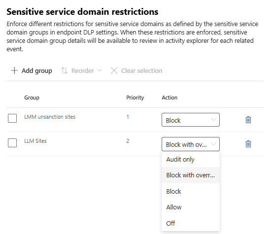Här kan vi antingen importera CSV filen vi exporterade från Defender for Cloud apps eller lägga in domänerna för hand när vi skapar upp en domain group. I mitt exempel, LMM unsanction sites och LMM sites![]()
