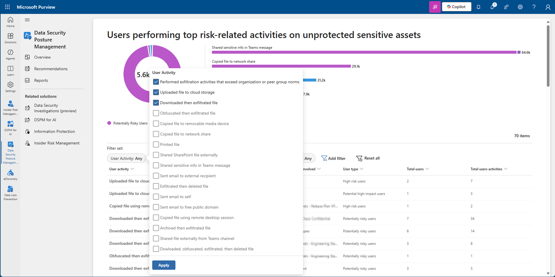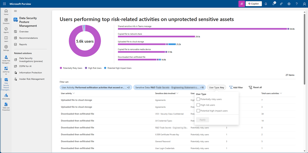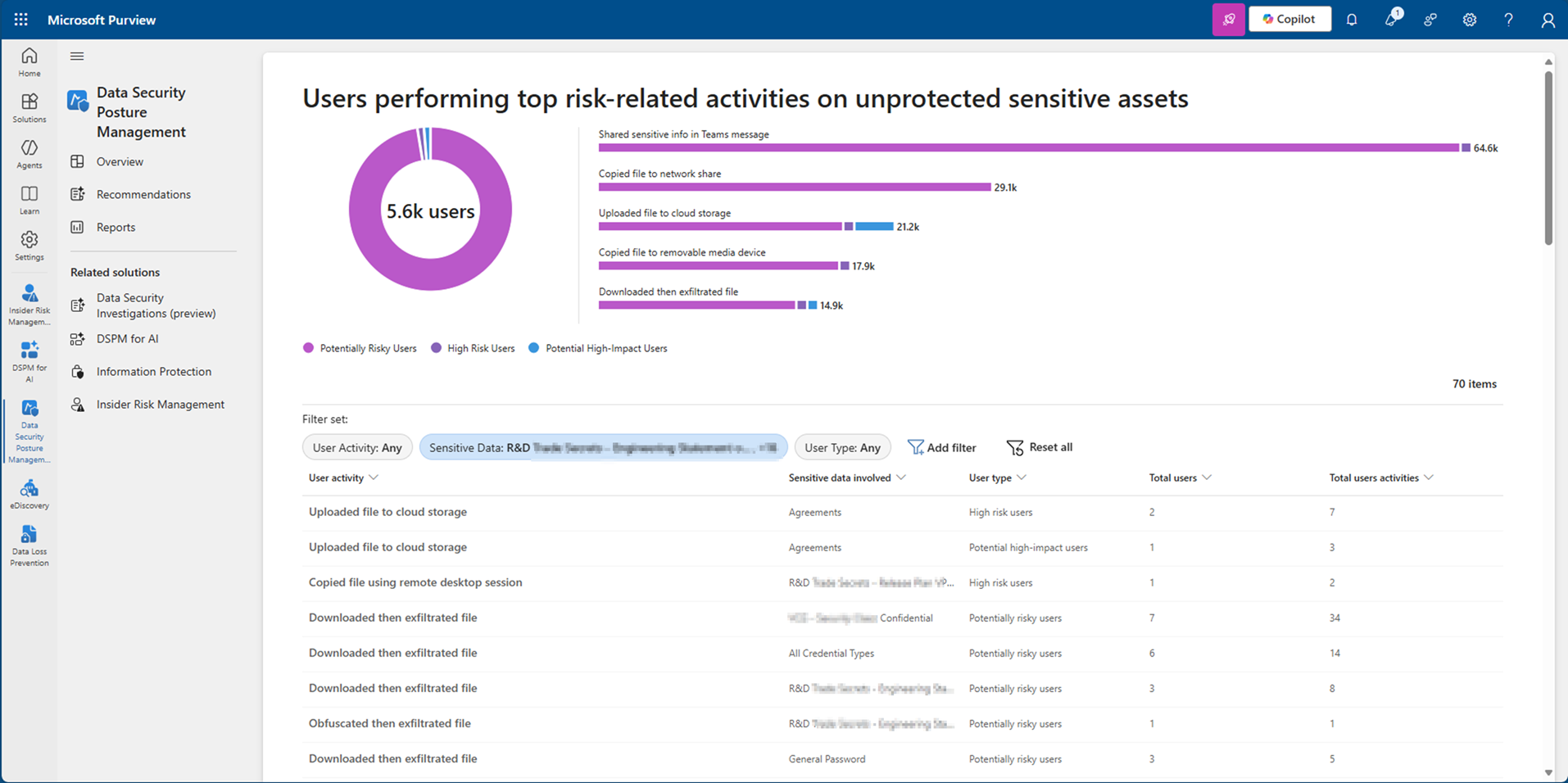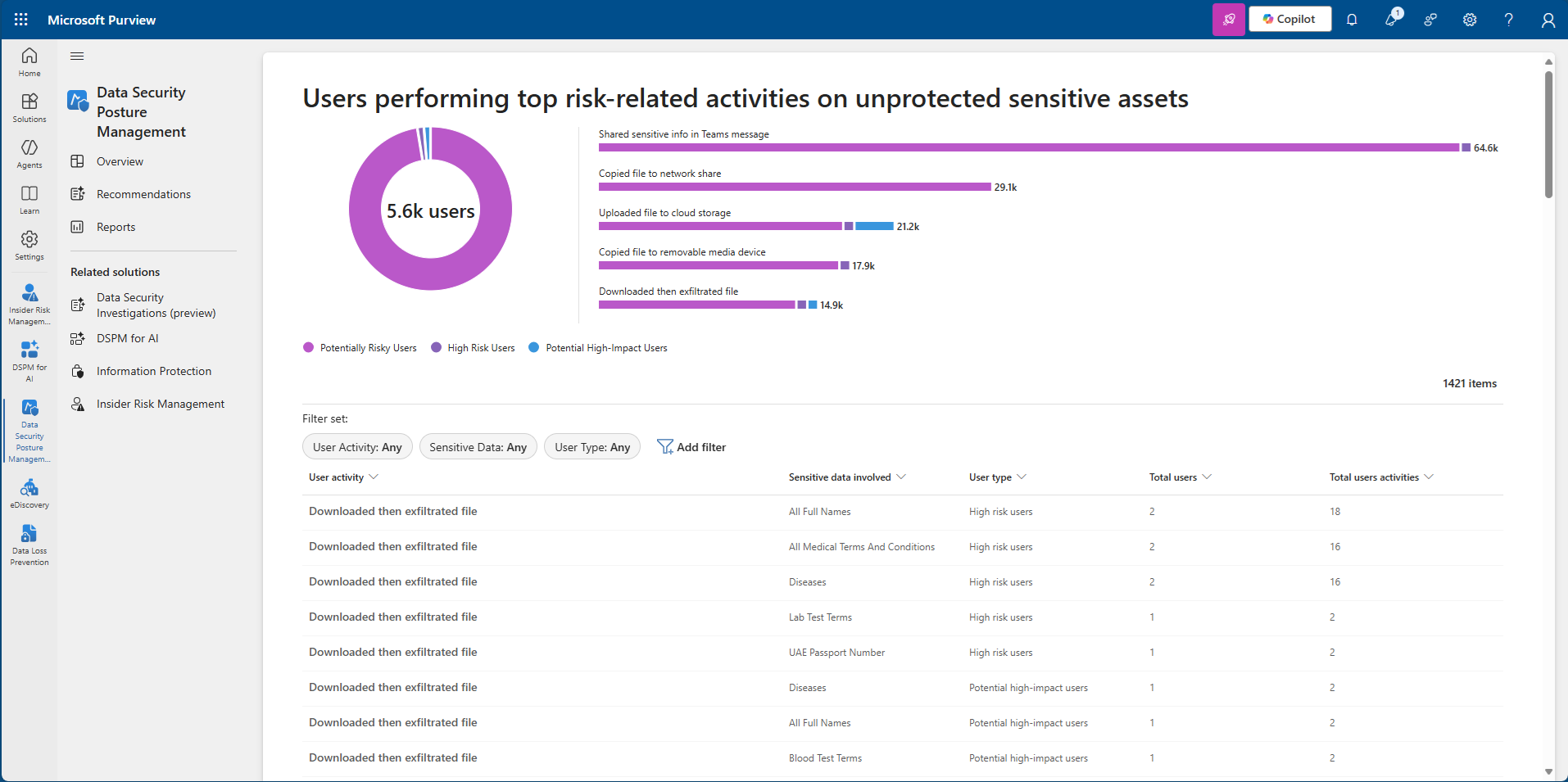 Once DSPM surfaces High-risk users, Potential risky users, or exfiltration activity, Insider Risk Management is the built in tool for investigations but you can also accelerate investigation using Microsoft Security Copilot embedded in Purview.