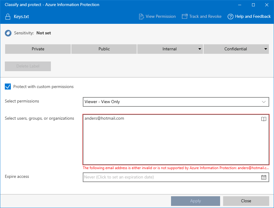 Tack vare den tjänst som idag heter Secure Email och går även under namnet Office 365 Message Encryption version 2 (OMEv2) har vi sedan en tid tillbaka kunnat skydda både mail och även bifogade Officefiler även till publika mailtjänster. Lösningen bygger på att mottagaren i själva verket loggar in mot avsändarens Office 365 -miljö för att både läsa mailet via Outlook online och bifogade filer via Office online. Idag kan vi dock inte skydda en fil exempelvis via Office eller AIP klienten till en publik adress och mottagaren kan inte ladda ner en bifogad fil och konsumera utanför webbgränssnittet.